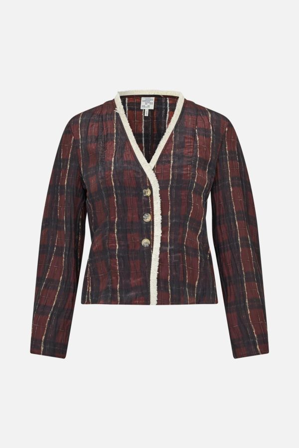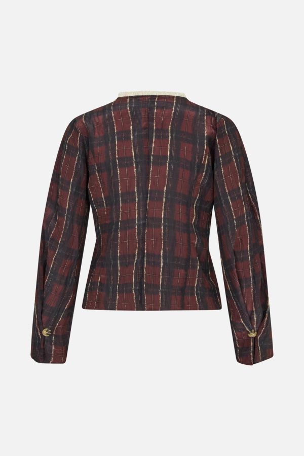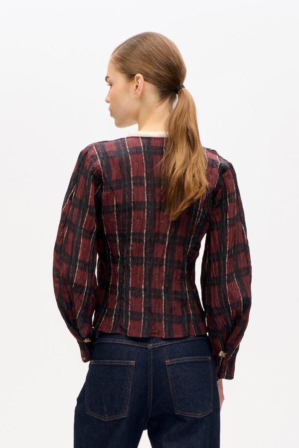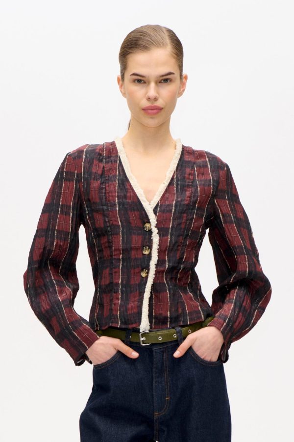 Baum und Pferdgarten Millea Shirt | Women’s Dark Red Check V-Neck Top with Frayed Hem