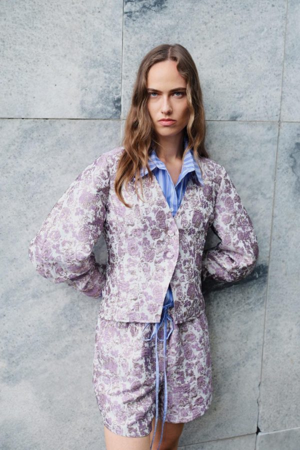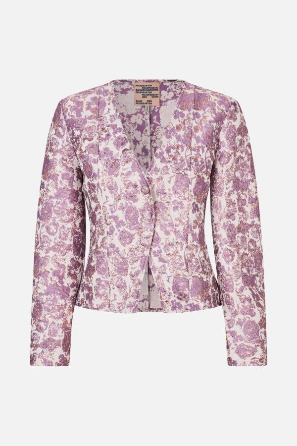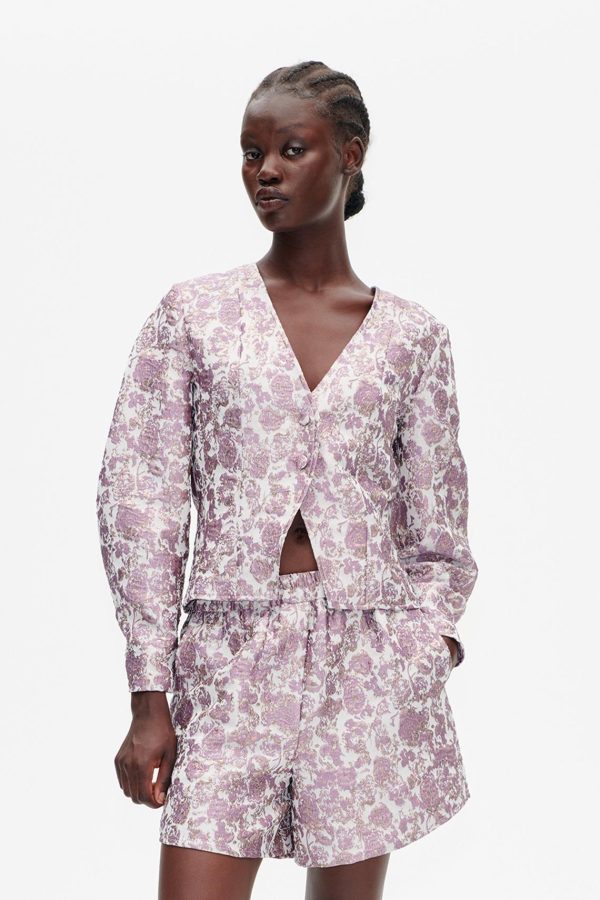 Be the first to review “Baum und Pferdgarten MILLIE Blouse | Women’s Jacquard Top with Metallic Threading, V-Neck & Voluminous Sleeves in Golden Purple Rose” Cancel reply