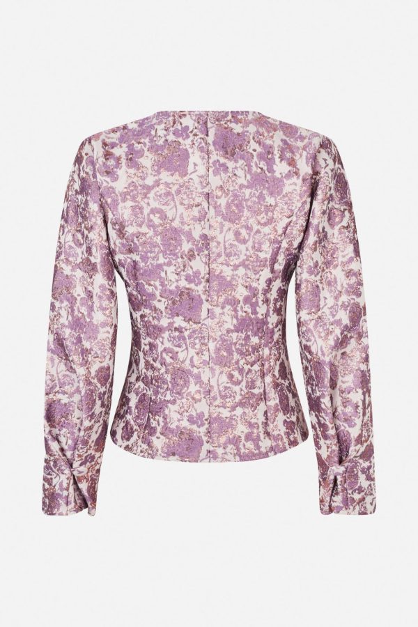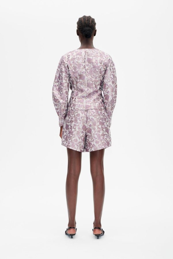 Baum und Pferdgarten MILLIE Blouse | Women’s Jacquard Top with Metallic Threading, V-Neck & Voluminous Sleeves in Golden Purple Rose