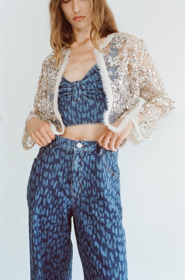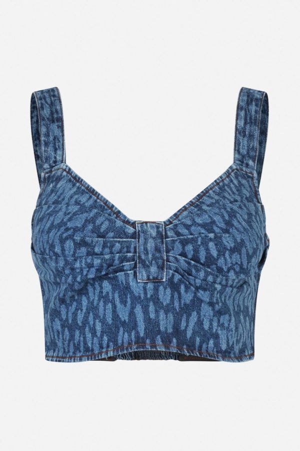 Baum und Pferdgarten Women’s MEKIRA Denim Crop Top – Adjustable Straps, Smocked Back, Vintage Blue Leopard