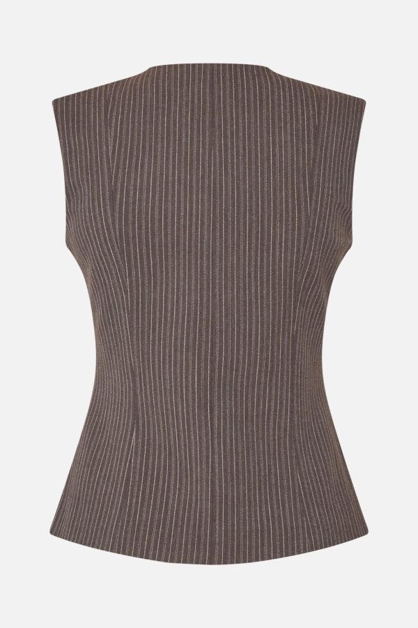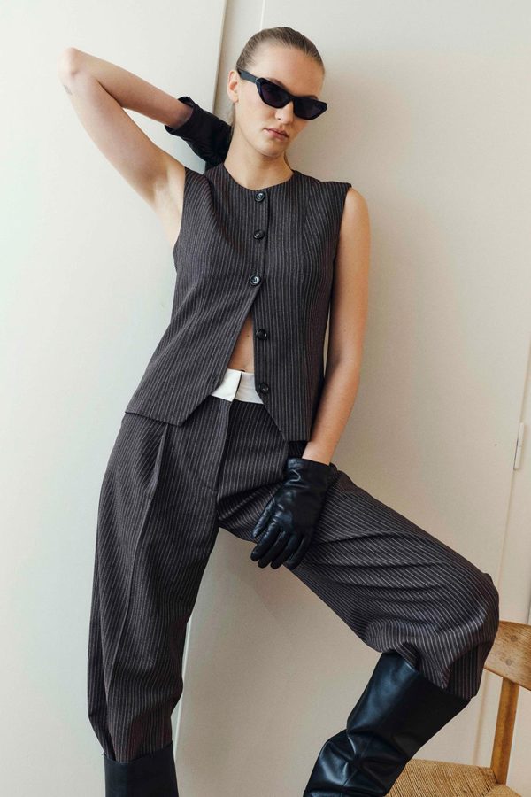 The Menea Top is the perfect pinstriped suit vest for any occasion. The feminine vest has a figure-hugging fit with crew neck and classic button closure for a timeless yet modern design. Style it jeans or a skirt for a cool everyday look or pair it with our Neyat Trousers for an elegant work wear outfit.