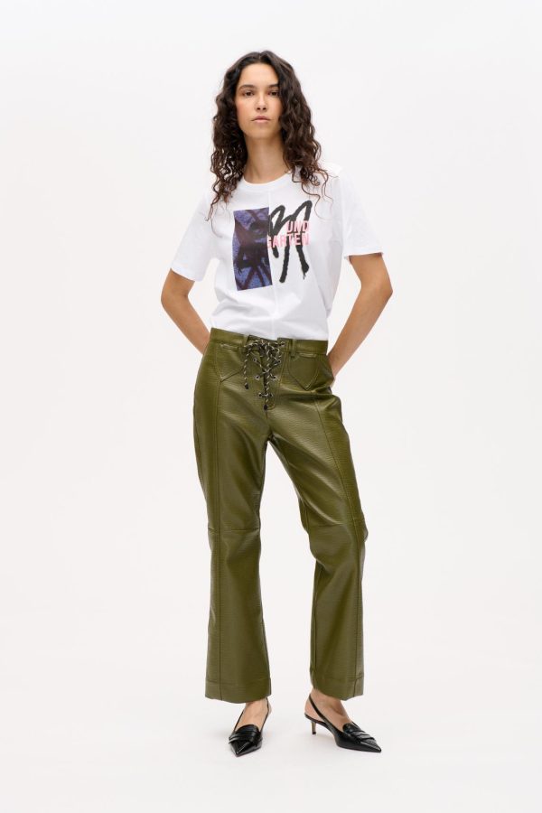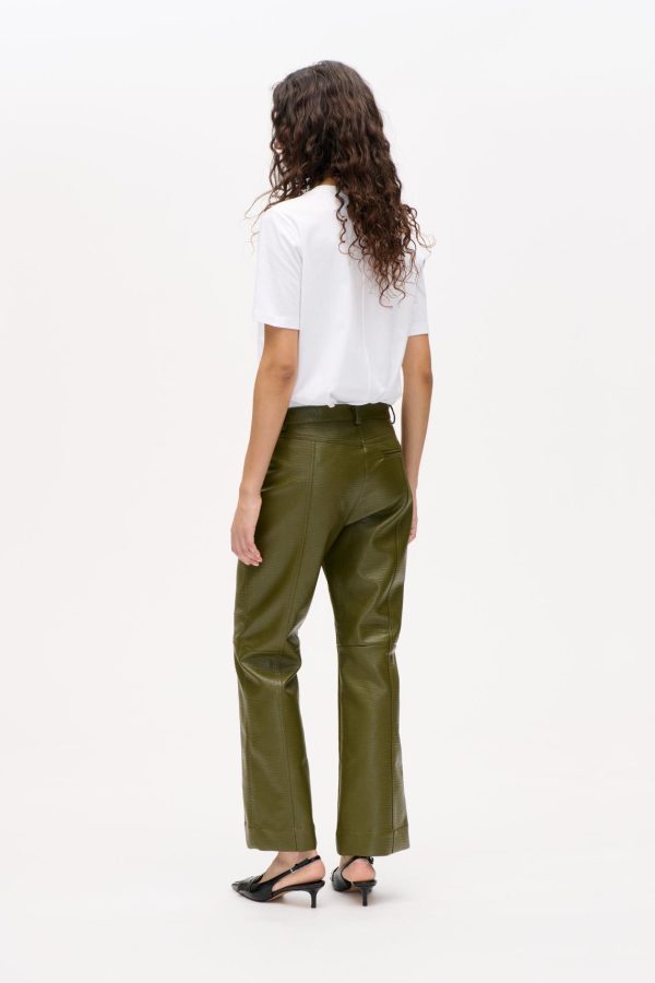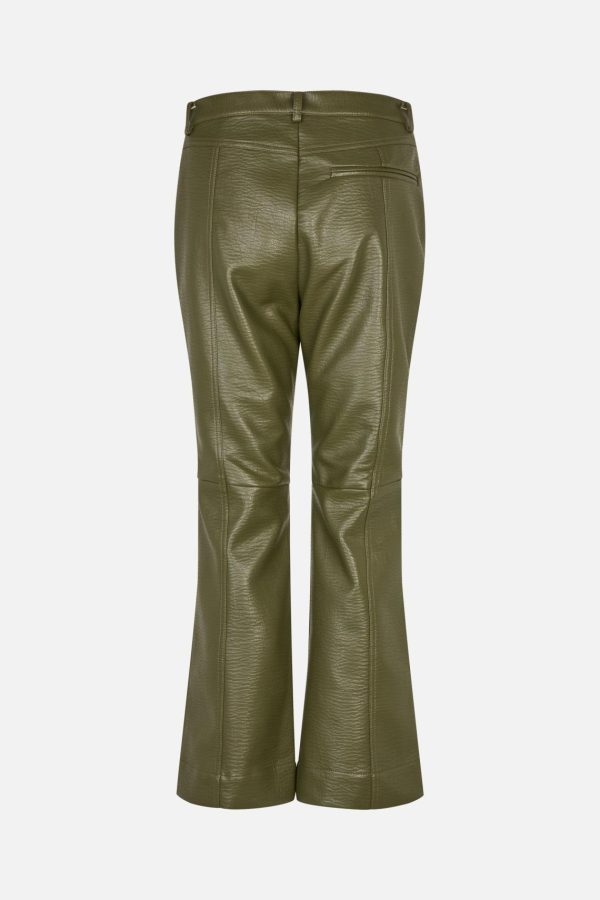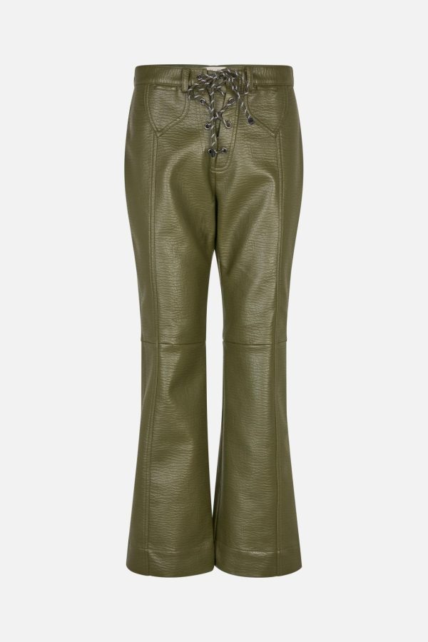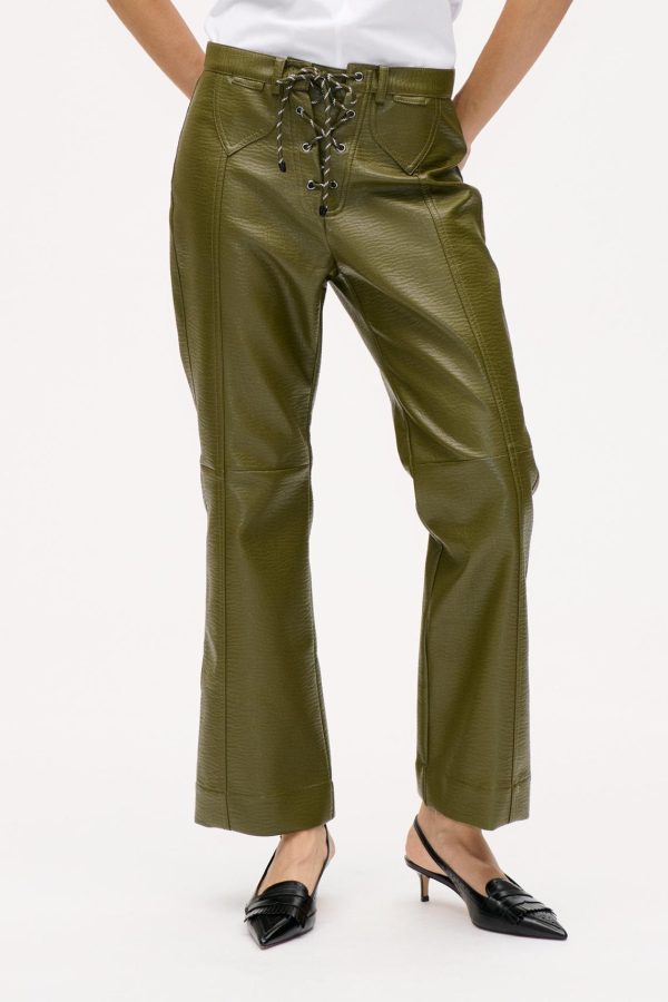 The Nicci Trousers bring bold attitude with a sleek silhouette. Made in textured faux leather, these bootcut trousers have a slightly flared leg and lace closure for an edgy finish. The faux leather trousers have many cool details such as belt loops and visible seams down the front and back of the trousers. Pair them with a T-shirt or top for an effortlessly cool look – or go all in with the matching Beah Jacket.