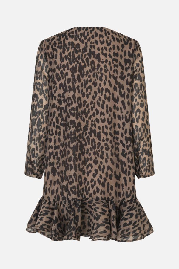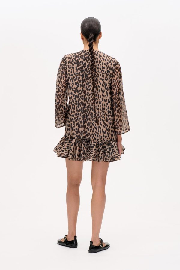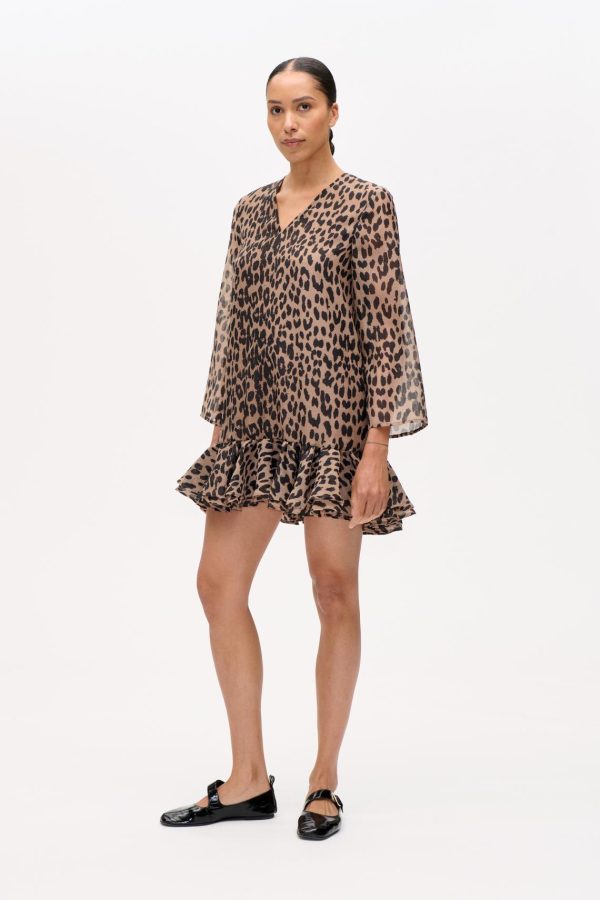 The Agnel Dress makes a statement with its bold leopard print and lightweight organza fabric. The flowy minidress has a flattering v-neck and loose fit for a comfortable yet elegant look. It’s lined for extra comfort and has a pretty ruffle at the hemline for added detail. Perfect for any occasion and easy to style with heels for an effortlessly chic outfit.