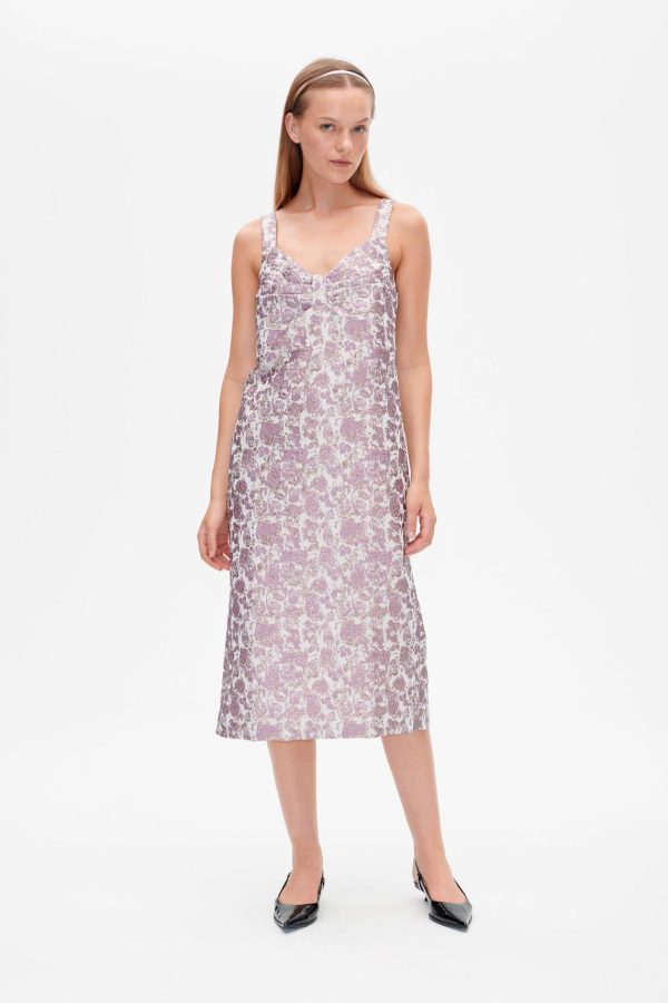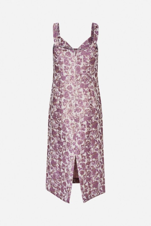 The Amneh Dress is a fitted midi-length column dress that radiates sophistication and glamour. Designed with adjustable straps for a customizable fit and a zip closure in the back for easy wear, this dress is as practical as it is stylish. The folded details across the chest, gathered at the center, add a unique and elegant touch, while the back slit ensures ease of movement and a subtle hint of allure. Crafted from beautiful jacquard fabric with metallic thread, the Amneh Dress boasts a luxurious, shimmering finish that catches the light beautifully, making it perfect for evening events or special occasions.
