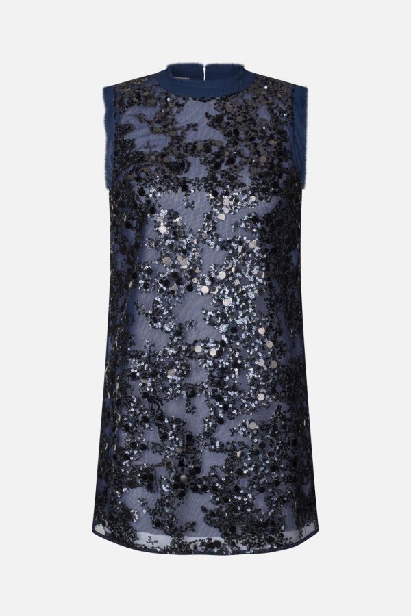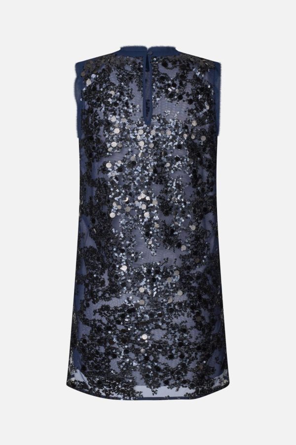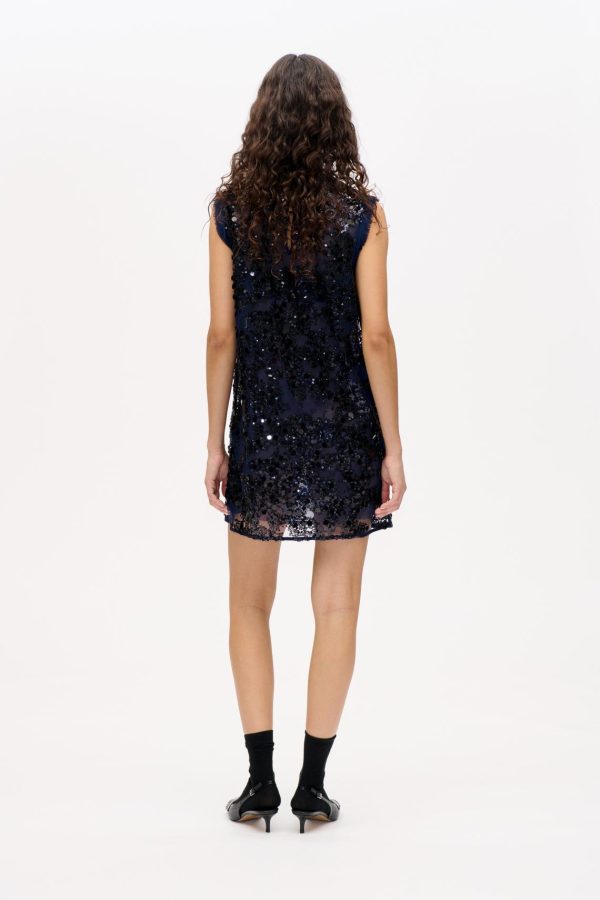 The Anira Dress is made in a shimmering sequins design that makes a shining statement. The sleeveless mini dress has a relaxed fit with a flattering crew neck and frayed edges at the neckline and shoulders. It has a mesh lining underneath the sheer sequins layer for some extra coverage. Perfect for special occasion – or perhaps your next event.