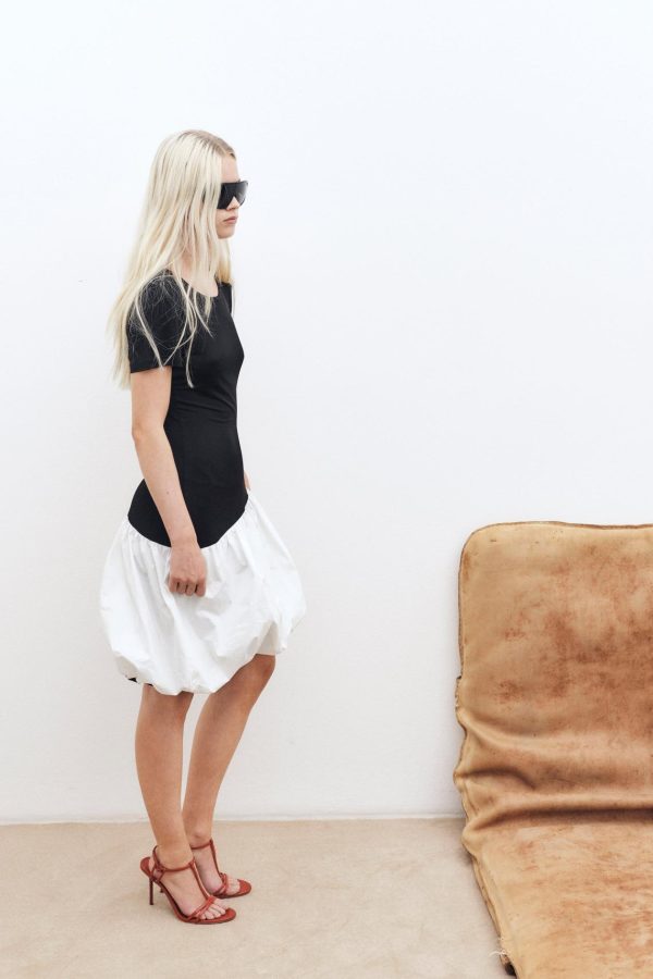 The Jet Dress is an elegant and timeless addition to your wardrobe with a fitted body and voluminous balloon skirt. Think little black dress with a twist, as the short-sleeved minidress has an asymmetrical dropped waist that gives the perfect contrast to the volume at the bottom. Add a pair of heels or flats for an evening out.