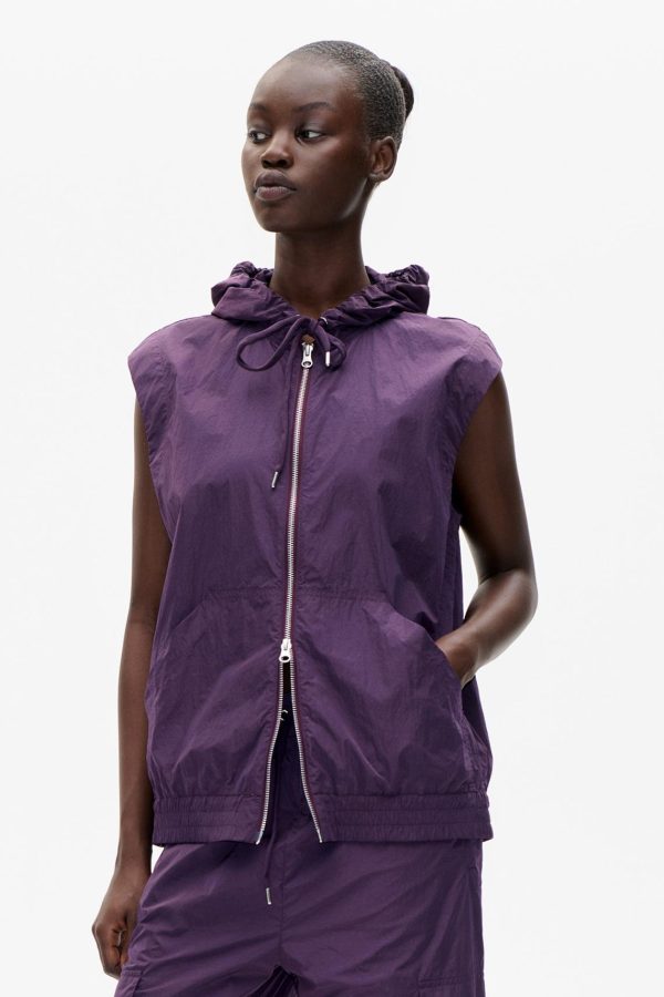The Becky Vest gives a new spin on the classic tracksuit. The sporty vest is made in nylon and has practical features such as hood with drawstring, elasticated bottom hem and pockets at the sides. Style it with the matching Nemu Trousers to complete the sporty suit. To dress it up for a night out, switch out the sneakers with a pair of heels.