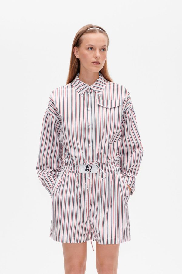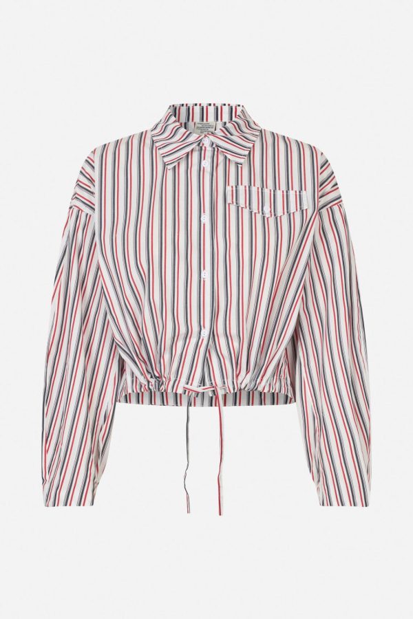 The Bryce Shirt is a cropped cotton shirt that gives a contemporary twist to the classic design. It features a drawstring hemline with a tie at the front, creating a flattering, adjustable fit at the waist. A split in the back adds a breezy, relaxed feel, while the chest pocket offers a practical yet stylish detail. The voluminous sleeves complete the look, adding a touch of bold sophistication to this versatile piece.