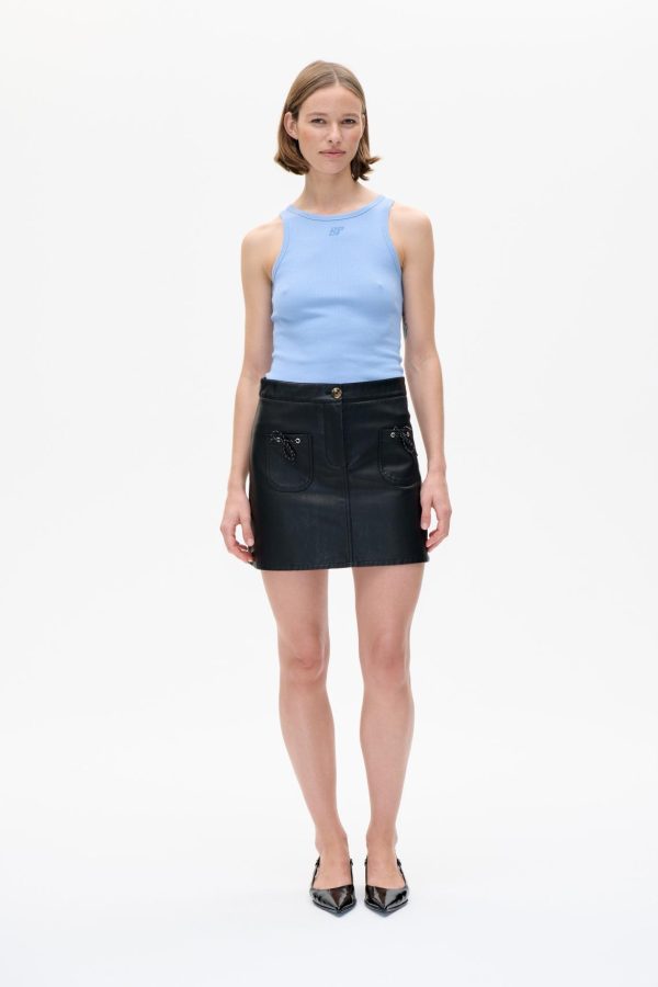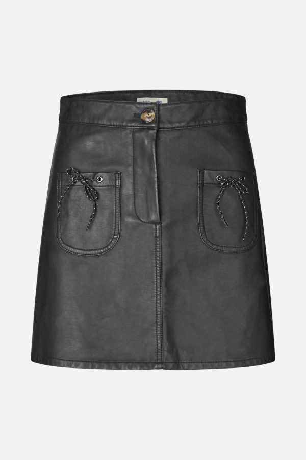 The Saima Skirt is a timeless style designed to be a must-have. The faux leather miniskirt has patch pockets at the front with nylon ties and is fully lined. Style it with one of our tops and cardigans for the office or add a blouse and heels for a night out.