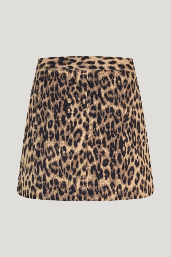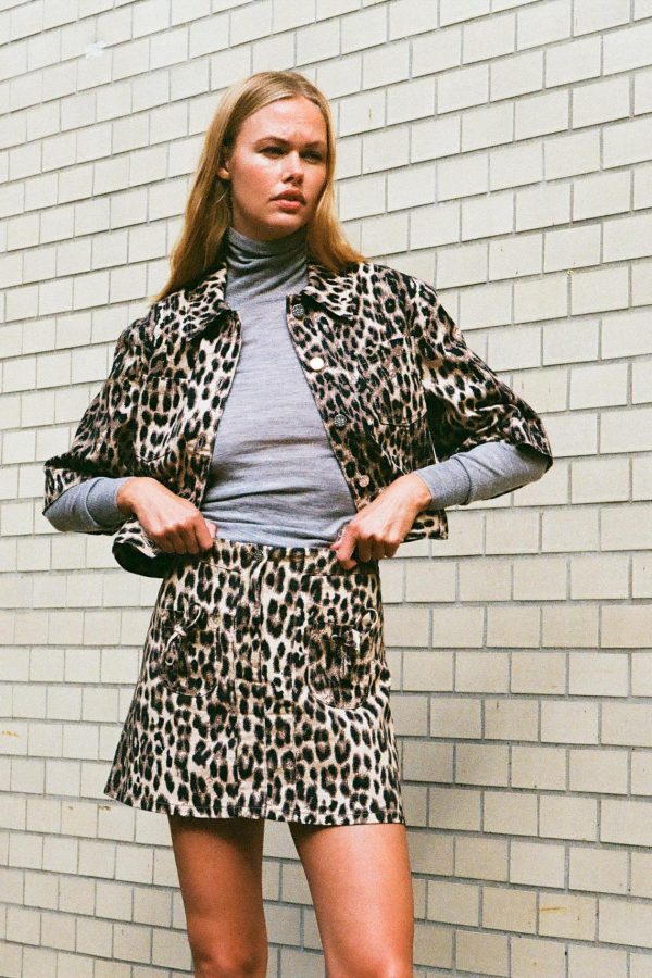 This high-rise denim miniskirt features a zip fly with button closure and small patch pockets in the front. There are ties at the tops of the pockets.