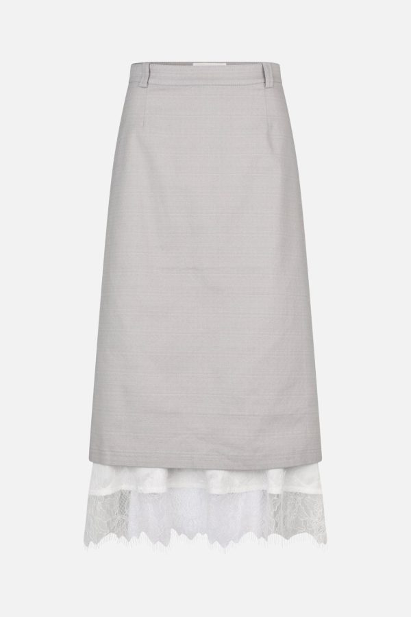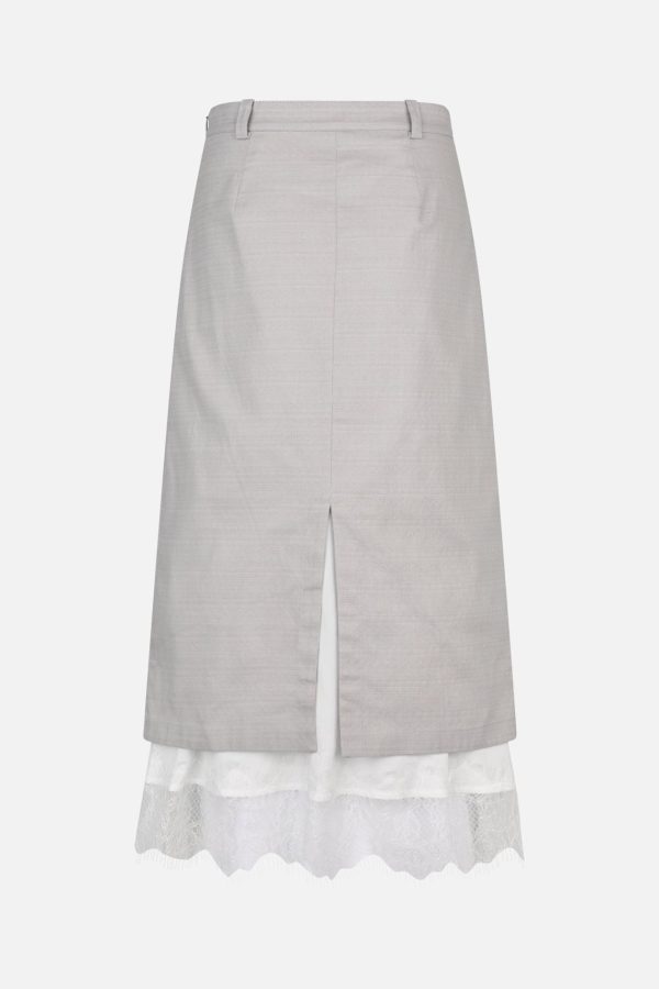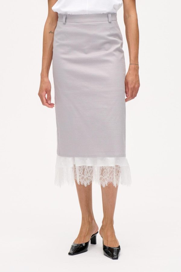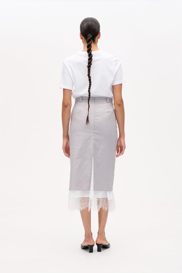 The Shafic Skirt has a flattering pencil skirt silhouette with a romantic twist. The midi skirt has an elegant double layered design made in structured organic cotton with a soft inner layer with lace at the hemline that peeks out at the bottom of the skirt. The skirt is slightly fitted with a slit at the back for some added movement. Style it from office hours to after hours with heels and a shirt.