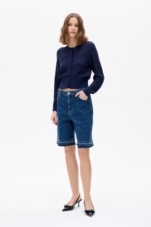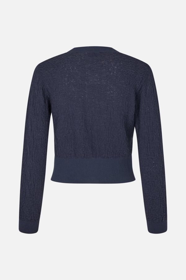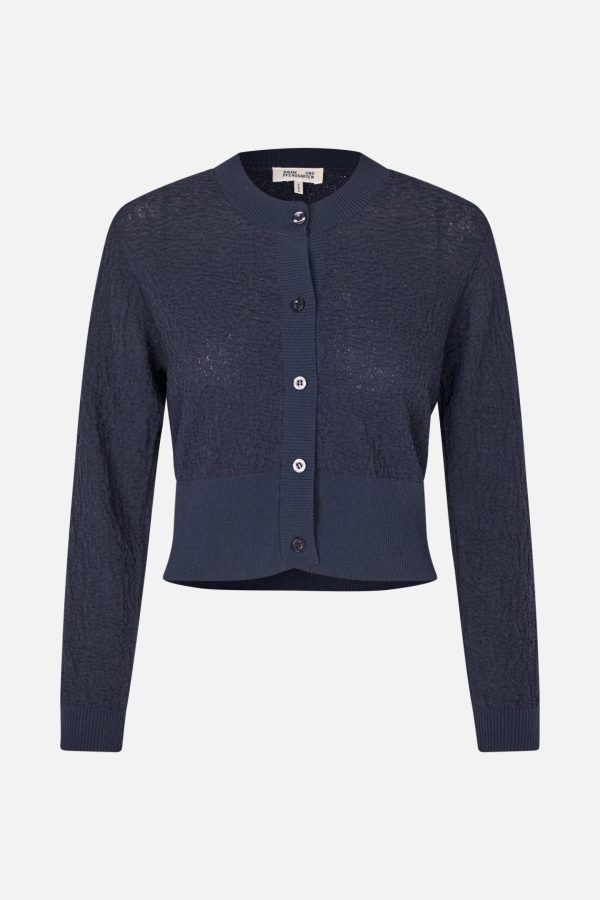 The Chea Cardigan is an everyday favorite with a modern touch, as it has a slightly crinkled texture along the ribbed details at the neck, hem and cuffs. The classic cardigan’s fitted silhouette and slightly cropped length make it perfect for layering. Style it with a skirt for a chic look or pair it with jeans for a casual twist.