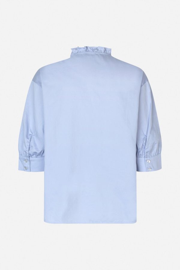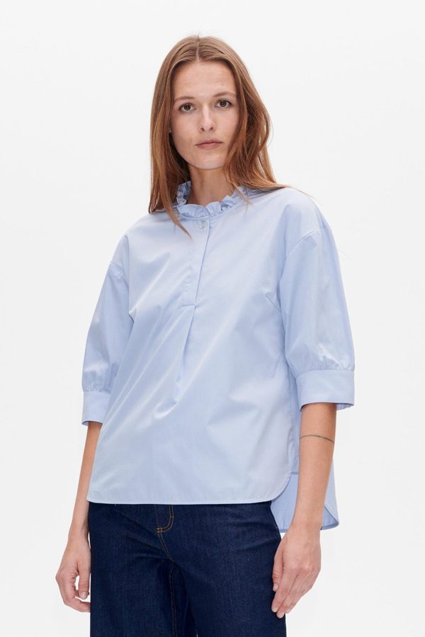 The Merelle Blouse is an elevated classic with a feminine twist made in organic cotton. The short-sleeved blouse has an elegant ruffled high neck and a slightly loose fit. The blouse has several classic details such as cuffs at the elbows and a planket with two buttons halfway down the front. The blouse also has dropped shoulders and curved hem that is longer in the back for a timeless fit. Style it with a pair of jeans for an effortless everyday look.